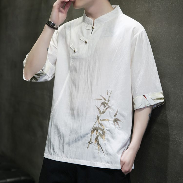 Men’s Asymmetrical Hanfu Chinese Style Summer Ice Silk Short Sleeve T-Shirt – Loose Fit Embroidered Mid-Sleeve Tee